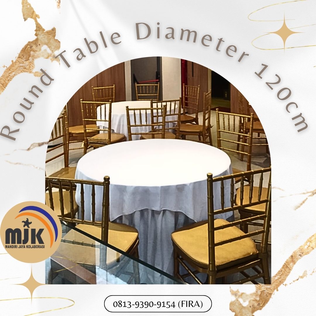 Round table dengan diameter 120 cm adalah salah satu pilihan populer untuk berbagai jenis acara, mulai dari pesta pernikahan hingga pertemuan bisnis.