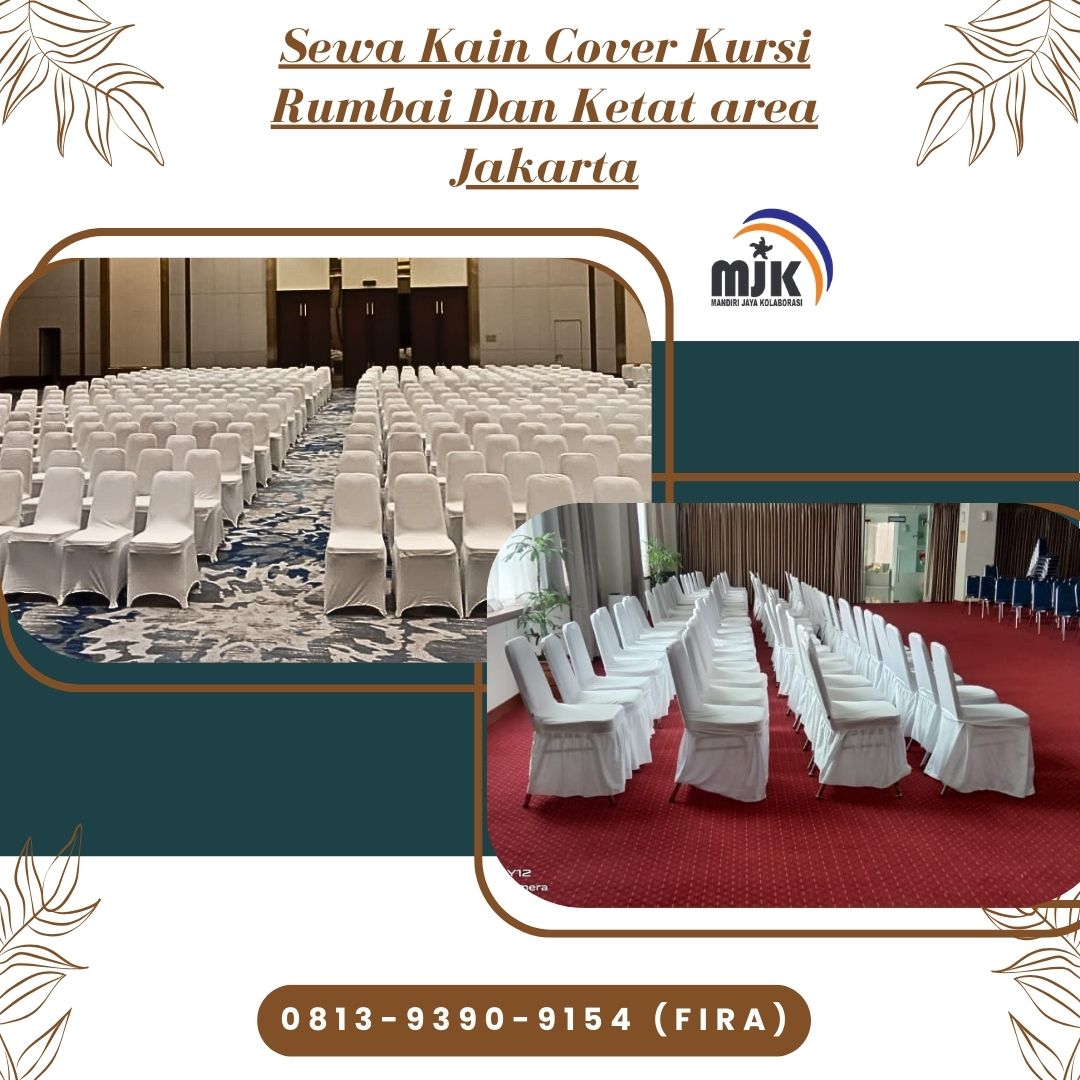 CV Mandiri Jaya Kolaborasi menawarkan layanan sewa kain cover kursi rumbai dan ketat untuk acara-acara di area Jakarta.