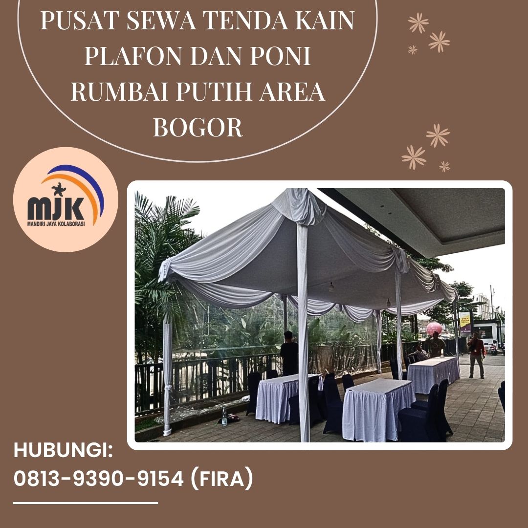 CV Mandiri Jaya Kolaborasi menghadirkan layanan sewa tenda kain plafon dan poni rumbai putih untuk kebutuhan acara di area Bogor.
